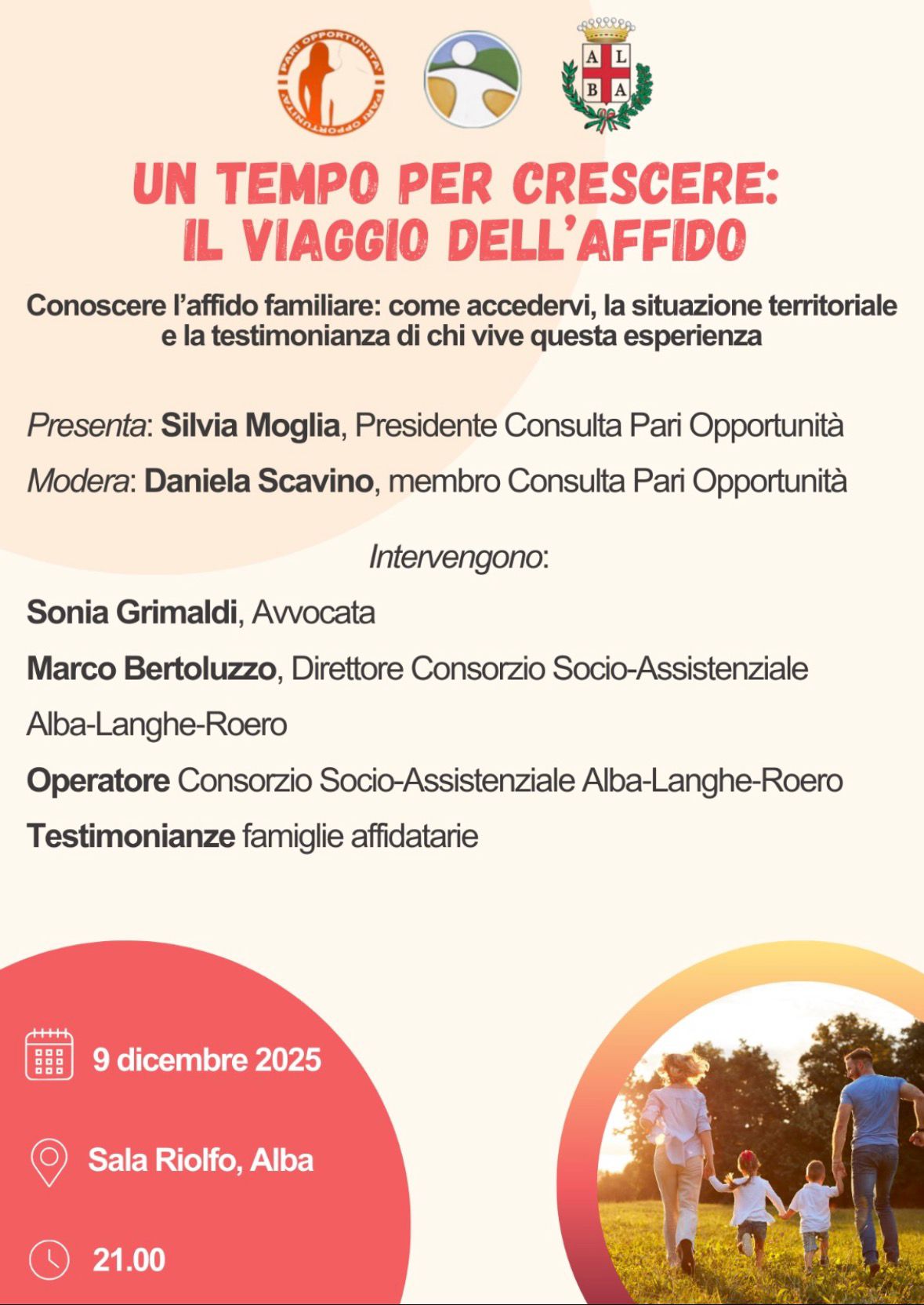 Il Consorzio socio assistenziale Alba-Langhe-Roero organizza una serata di sensibilizzazione sul tema dell'affido presso Sala Riolfo ad Alba il 9 dicembre ore 21:00