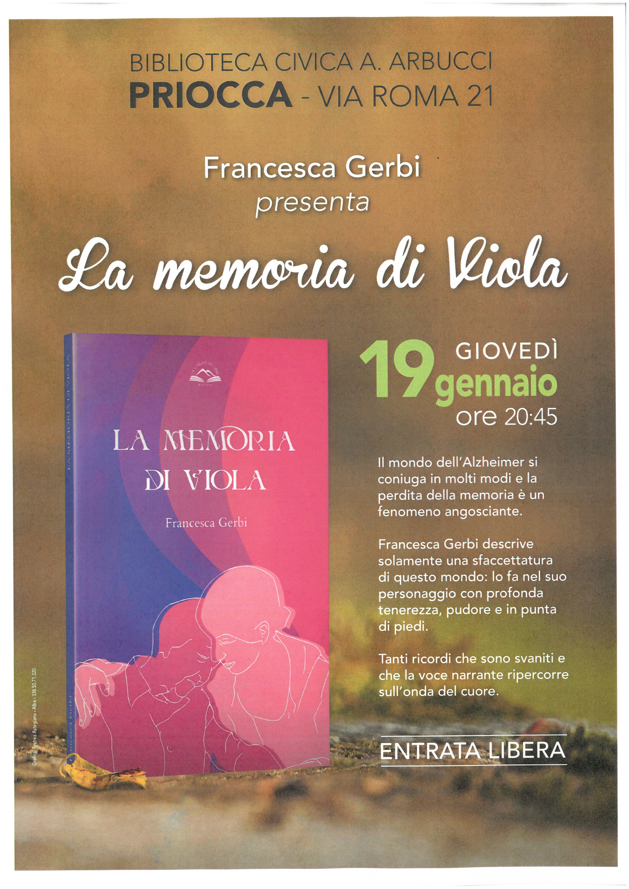 La Biblioteca Civica A. Arbucci di Priocca vi invita Giovedì 19 gennaio ore 20:45 alla presentazione del libro "La memoria di Viola" di Francesca Gerbi