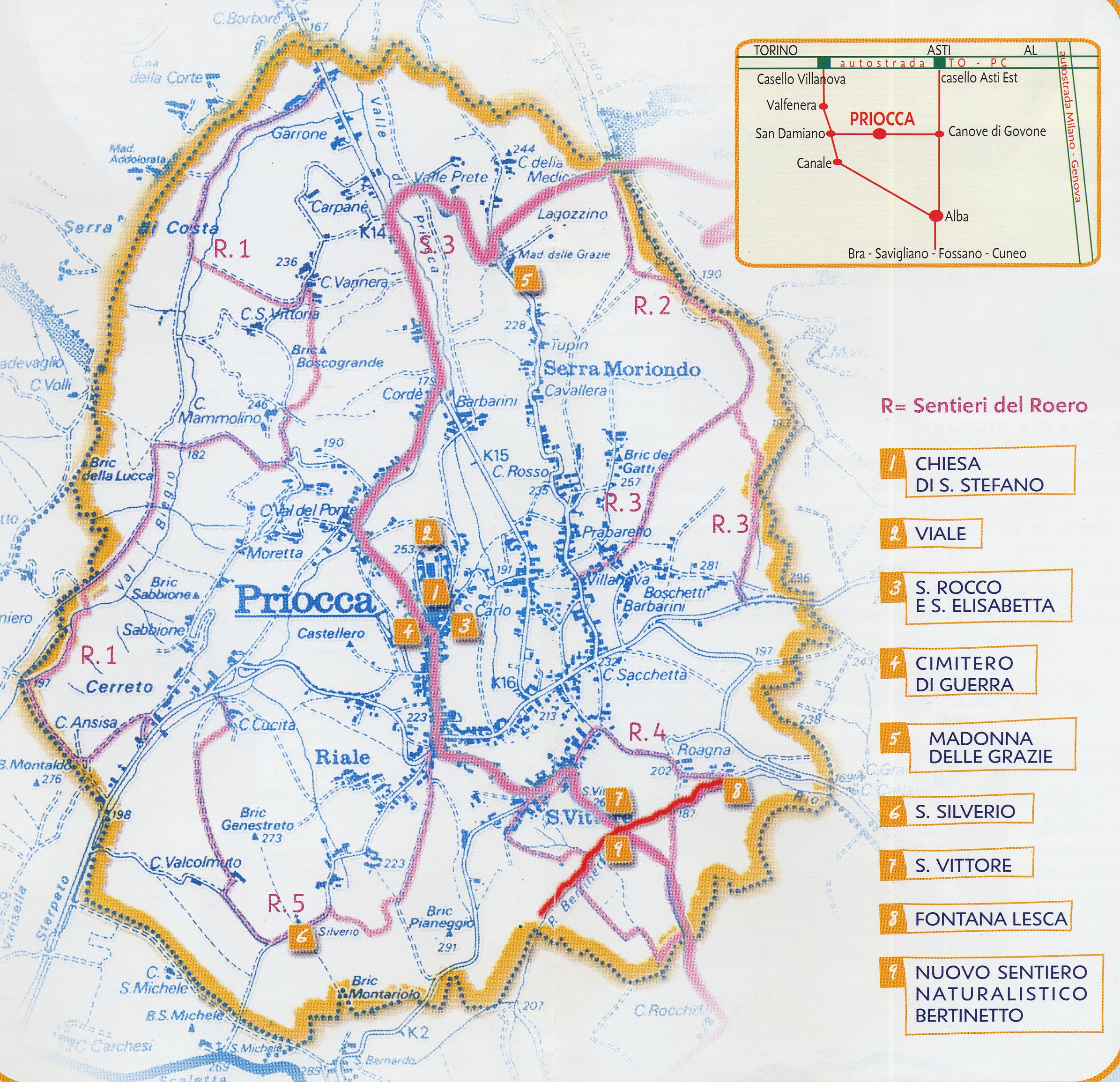 Priocca è inserito nei sentieri del Roero denominati S1 e S3, ben segnalati sulle guide turistiche locali e in loco con cartellonistica. Inoltre è fruibile il sentiero che costeggia il Rio Bertinetto.