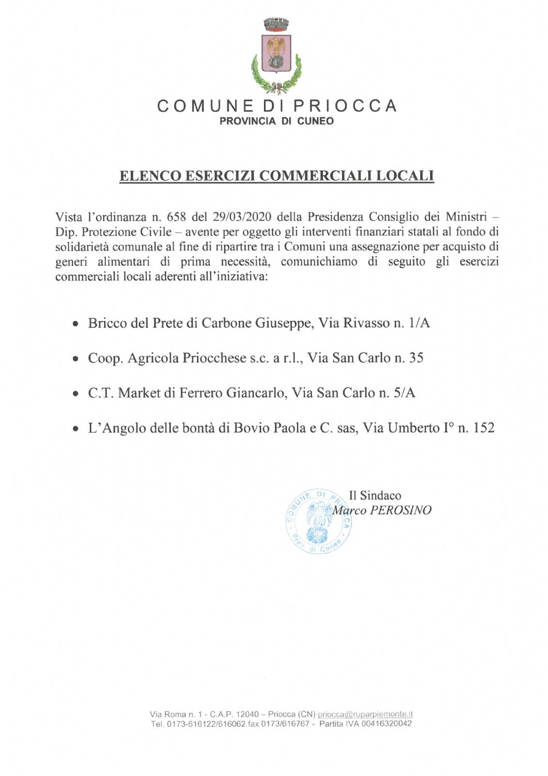 Ai sensi dell’ordinanza n. 658 del 29/03/2020 della Presidenza Consiglio dei Ministri – Dip. Protezione Civile – avente per oggetto gli interventi finanziari statali al fondo di solidarietà comunale al fine di ripartire tra i Comuni una assegnazione per acquisto di generi alimentari di prima necessità, comunichiamo in allegato gli esercizi commerciali locali aderenti all’iniziativa.