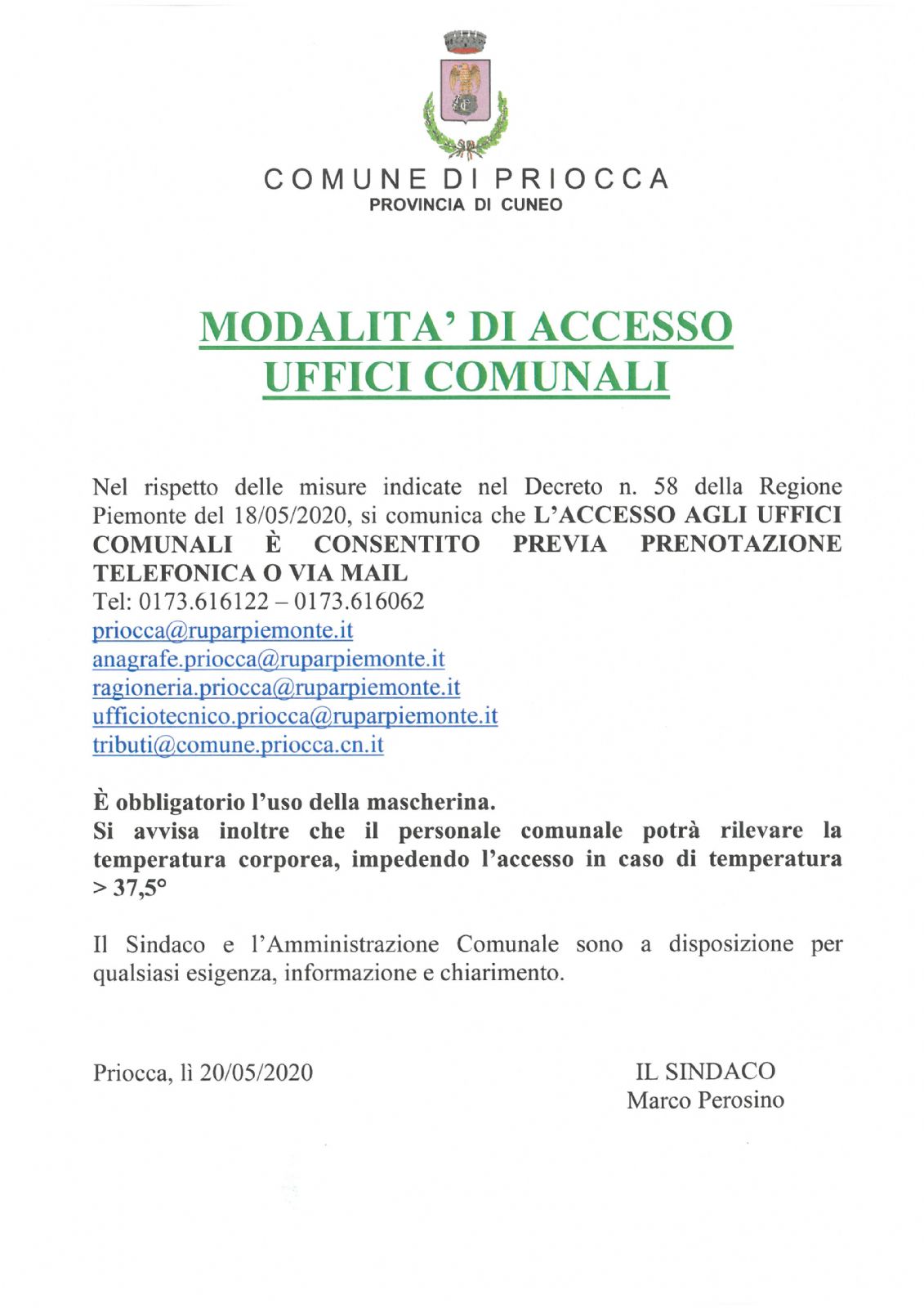 Nel rispetto delle misure indicate nel Decreto n. 58 della Regione Piemonte del 18/05/2020, si comunica che L’ACCESSO AGLI UFFICI COMUNALI È CONSENTITO PREVIA PRENOTAZIONE TELEFONICA O VIA MAIL